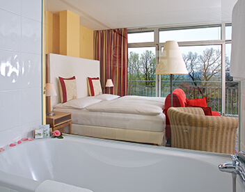 mit Dusche und Badewanne, WC separat, Fernblick, 6m Glasfront, ausgestattet mit SAT-TV inkl. Radio, Telefon, Minibar und Teebar.